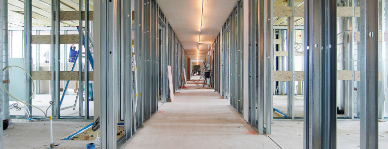 - De afbouw kan nu starten op een gestorte, vlakke vloer. Hierbij kan niet alleen geprofiteerd worden een vlakke werkvloer (perfecte aansluiting gipsplaat op vloer), maar ook van de mogelijkheid om maatwerk wanden in te zetten.